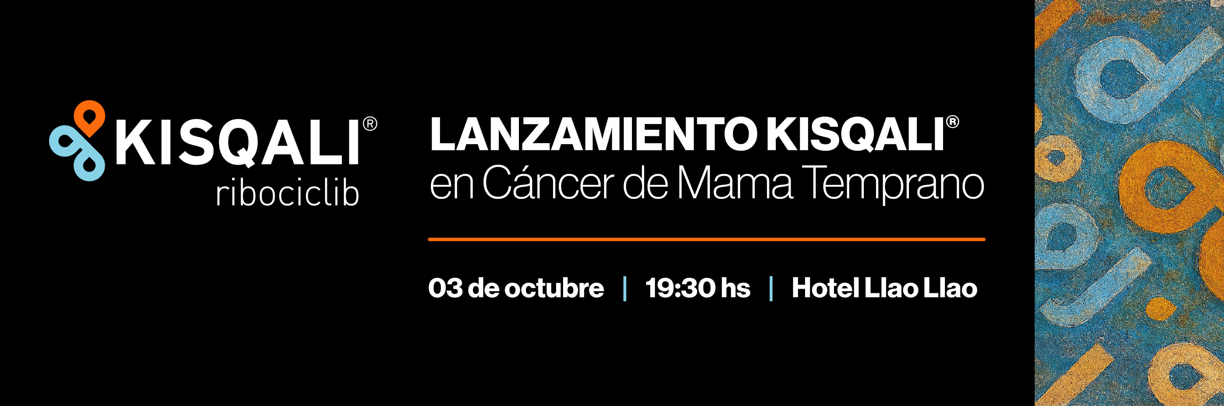 Los esperamos al término del primer día del Congreso Patagonia, el viernes 3 de octubre a partir de las 19:30 hs, en el Hotel Llao Llao (Av. Ezequiel Bustillo Km. 25, R8401 – San Carlos de Bariloche), para participar del Lanzamiento de Kisqali en Cáncer de Mama Temprano.